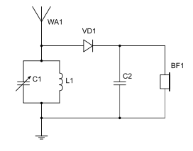 Он состоит из антенны и заземления подключённых к колебательному контуру из катушки L1 и перестраиваемого конденсатора C1, диодного детектора на диоде VD1, фильтра нижних частот, образованного C2 и сопротивлением наушников BF1, и самих наушников.
