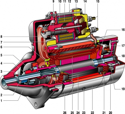 1 – крышка со стороны привода; 2 – стопорное кольцо; 3 – ограничительное кольцо; 4 – шестерня привода; 5 – обгонная муфта; 6 – поводковое кольцо; 7 – резиновая заглушка; 8 – рычаг привода; 9 – якорь реле; 10 – удерживающая обмотка тягового реле; 11 – втягивающая обмотка тягового реле; 12 – стяжной болт реле; 13 – контактная пластина; 14 – крышка реле; 15 – контактные болты; 16 – коллектор; 17 – щетка; 18 – втулка вала якоря; 19 – крышка со стороны коллектора; 20 – кожух; 21 – шунтовая катушка обмотки статора; 22 – корпус; 23 – винт крепления полюса статора; 24 – якорь; 25 – обмотка якоря; 26 – промежуточное кольцо.